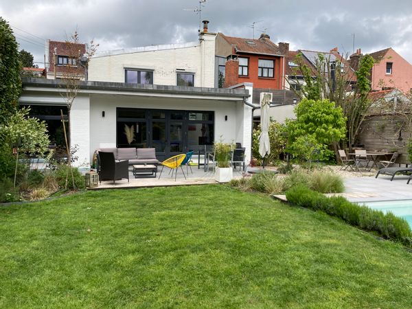 Maison avec piscine et jardin.
