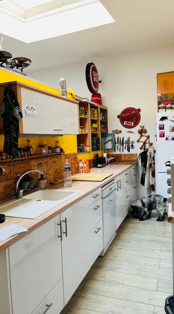 Une maison bleue, avec terrasse , où l’on peut se garer devant la maison. Calme